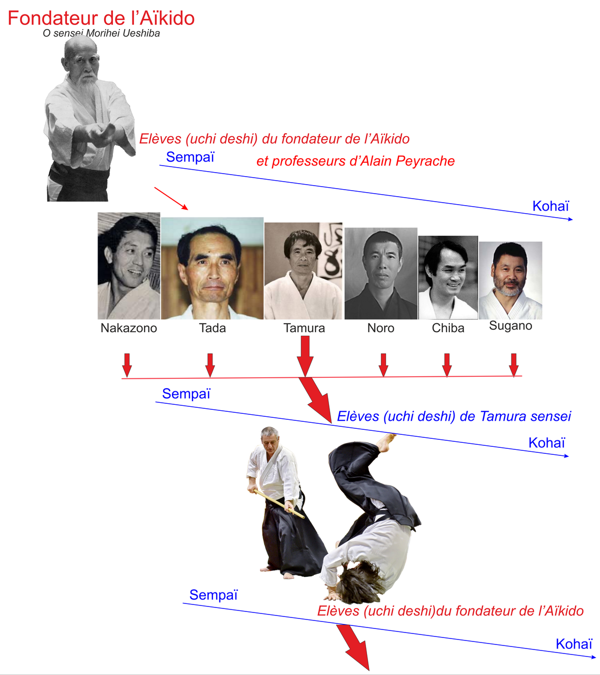 D'O Sensei Morihei Ueshiba (fondateur) à Nobuyoshi Tamura, de Tamura à Alain Peyrache shihan, d'Alain Peyrache à Alfred Rivéro notre sensei.